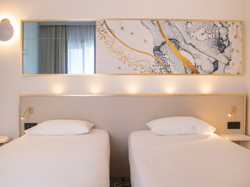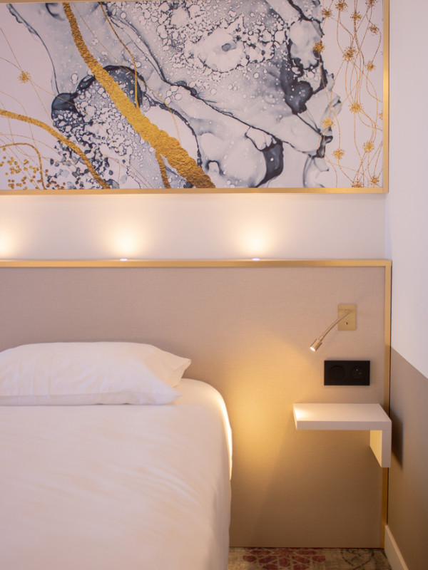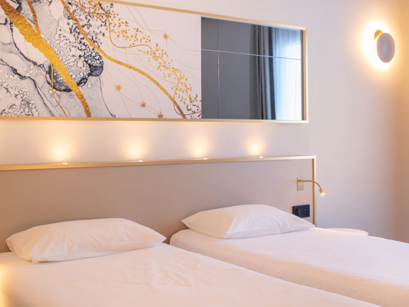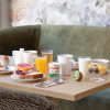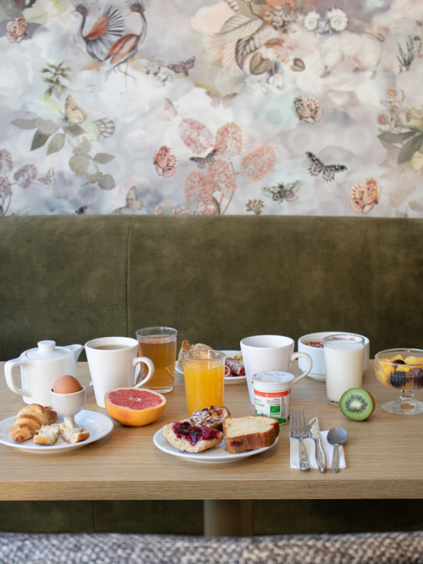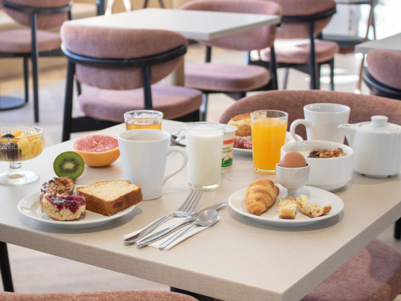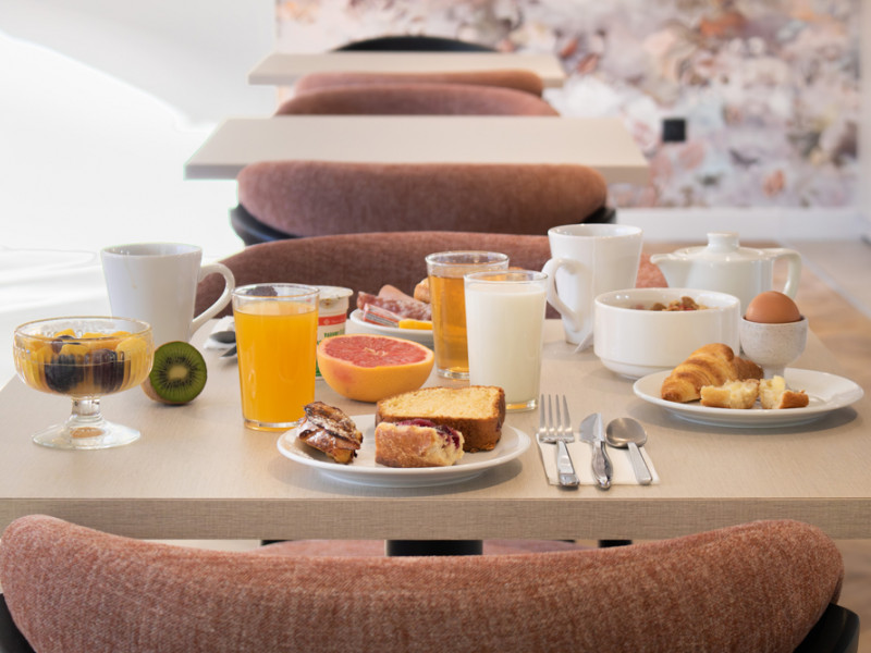 Por la mañana, disfrute de nuestro desayuno buffet desde las 7:00 hasta las 9:30. Se compone de muchos productos frescos y regionales: panes variados, bollería, guarniciones salados y dulces, productos lácteos, frutas... El desayuno no está incluido en el precio de la habitación: 12 EUR por persona.